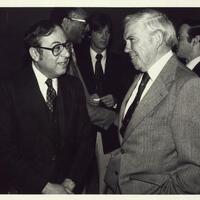 "Commencement, Spring 1980; Bernie Klein, Douglas Fraser (UAW President), Joseph Wrigh (Student Affairs), Pierce (Alumnus), Harold Shapiro (UM President)." In the digital collection UM-Dearborn Newsletter Photos. https://quod.lib.umich.edu/u/umdphotos1ic/x-31.162/umdph31_0162. University of Michigan Library Digital Collections.